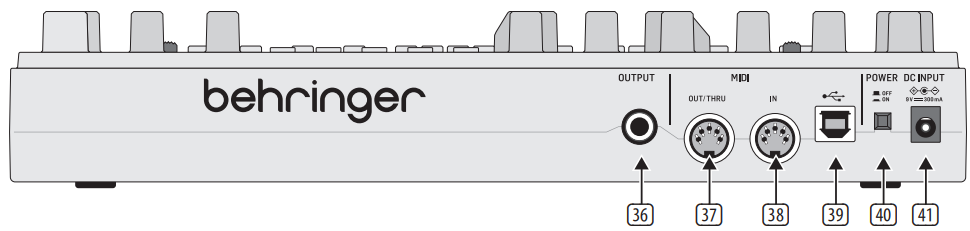 (37) MIDI OUT/THRU - esta toma DIN de 5 puntas se usa para dar salida a los datos MIDI OUT y pasar sin modificación los datos MIDI recibidos a través de la entrada MIDI INPUT.