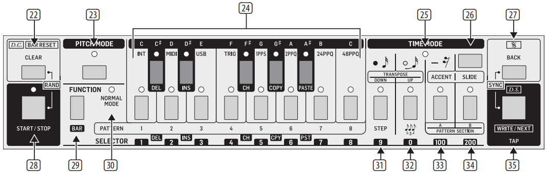 (27) BACK - cuando se vaya desplazando por el patrón, esto le permitirá elegir la última nota reproducida para que pueda editarla. Este interruptor y WRITE/NEXT(35) se usan para visualizar y cambiar los ajustes SYNC y CLOCK.