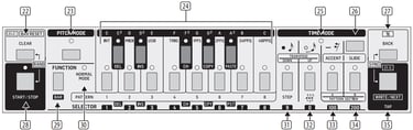 (24) TECLADO DE 13 NOTAS - estos interruptores están colocados como un teclado de 13 notas, lo que permite elegir notas a la hora de crear patrones. Los ocho interruptores de abajo se usan también durante la creación, almacenamiento y selección de patrones y pistas.