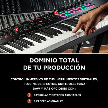 Todo lo que necesitas: auto-mapeo de controles DAW y ajustes de plugins; acorde y escala inteligentes; arpegiador; ruedas de tono y modulación; entrada de pedal de sustain; salida MIDI de 5 pines.