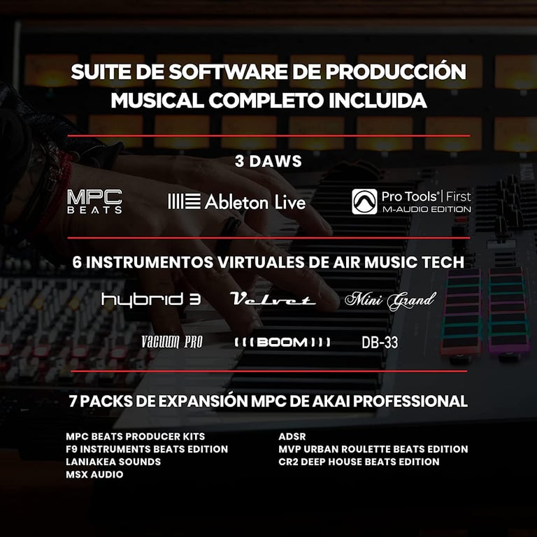 Incluye software de producción completo: Pro Tools | First Edición M-Audio, MPC Beats, Ableton Live Lite, 6 instrumentos virtuales de AIR Music Tech y 7 paquetes de expansión MPC Akai Professional.