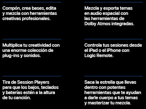 Logic Pro para Mac es una colección de herramientas para realizar tareas de composición, edición y mezcla en una moderna interfaz diseñada para obtener resultados creativos rápidamente y ofrecer más potencia cuando es necesario. Logic Pro incluye numerosos instrumentos, efectos, bucles y samples: un kit de herramientas para crear sonidos sorprendentes.